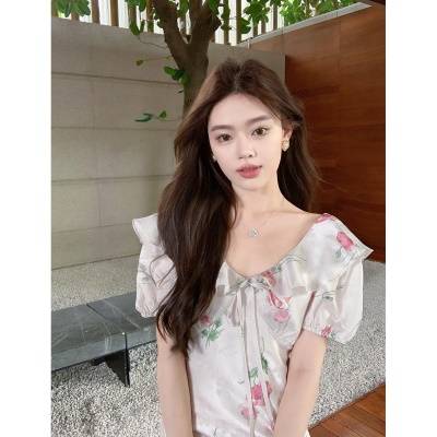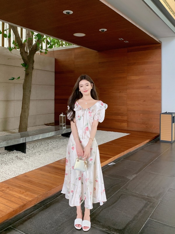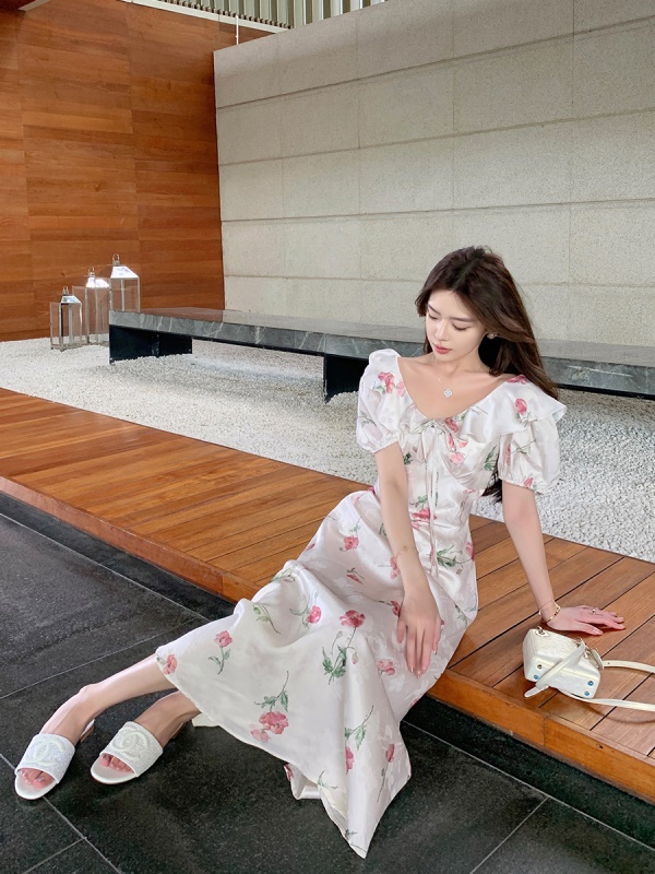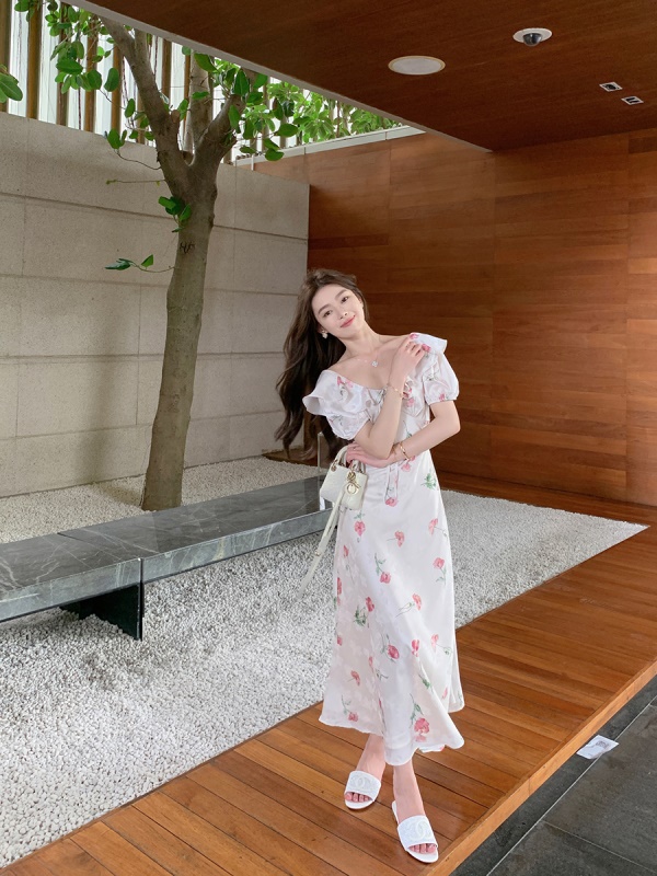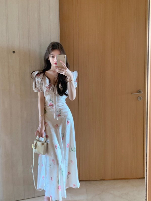 ByYou夏季新款荷叶边缎面V领白色碎花连衣裙长款显瘦包臀印花裙子