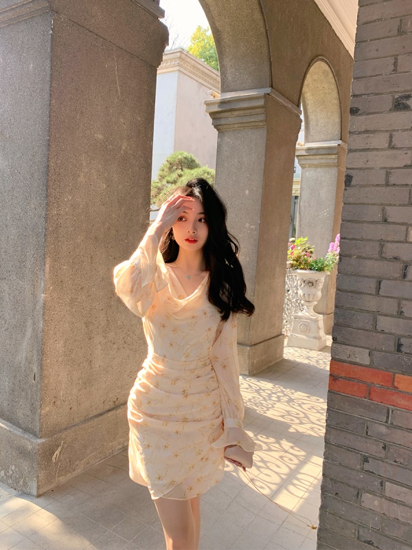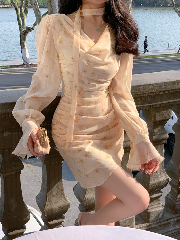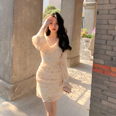 ByYou 夏季鹅黄色荡领碎花连衣裙女收腰显瘦褶皱包臀裙子含吊带裙