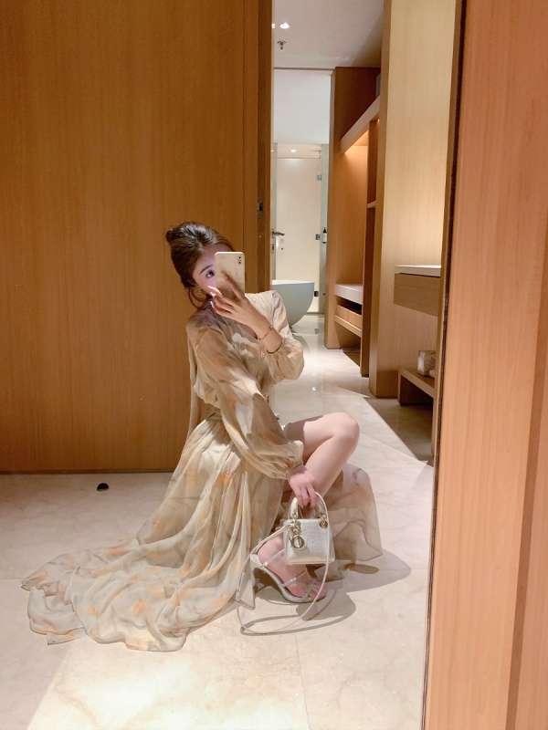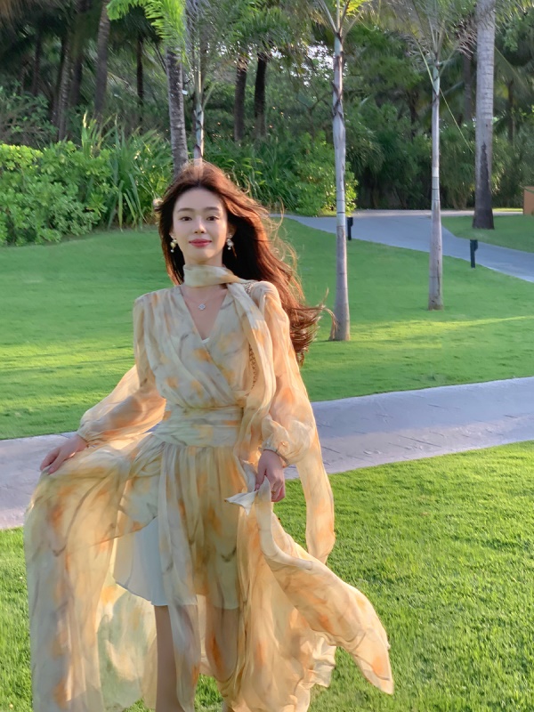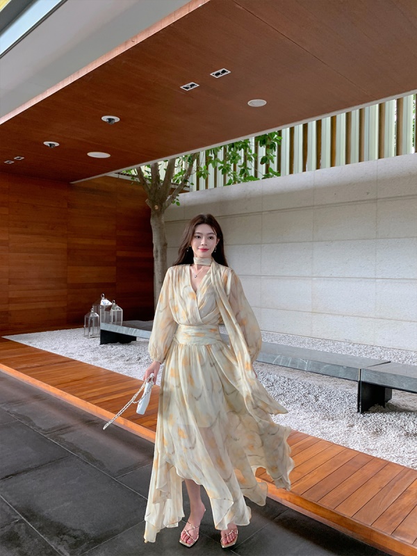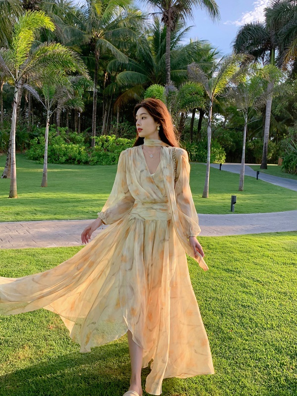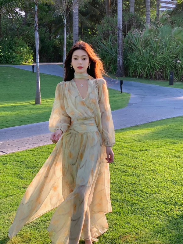 ByYou夏季新款气质v领泡泡袖黄色碎花雪纺连衣裙收腰显瘦仙女长裙
