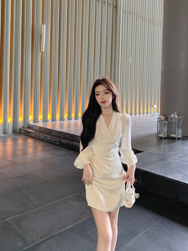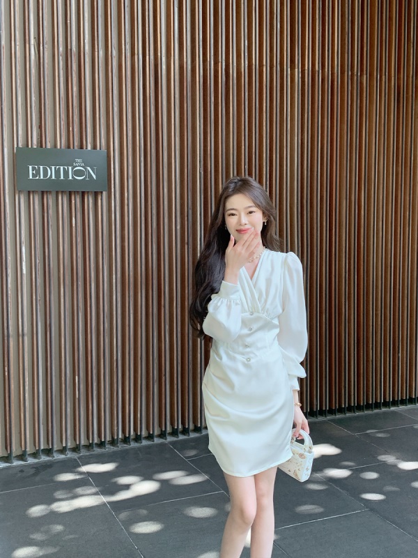 商品名称:ByYou 夏季新款珠光白色缎面拼雪纺连衣裙泡泡袖V领收腰包臀短裙