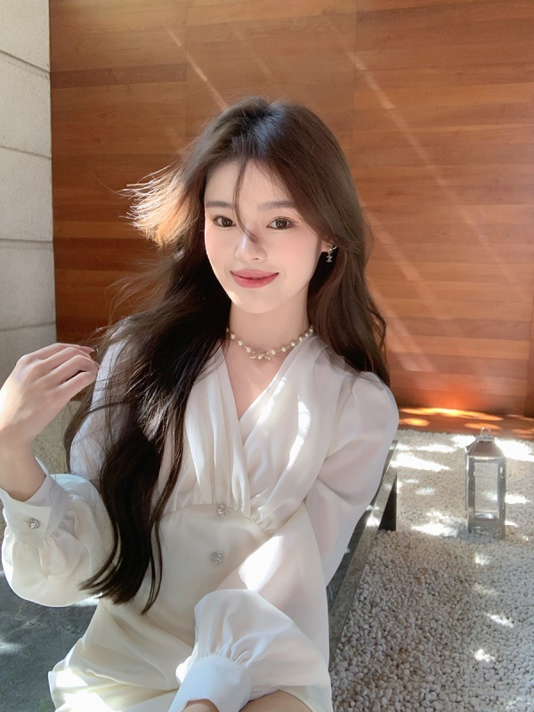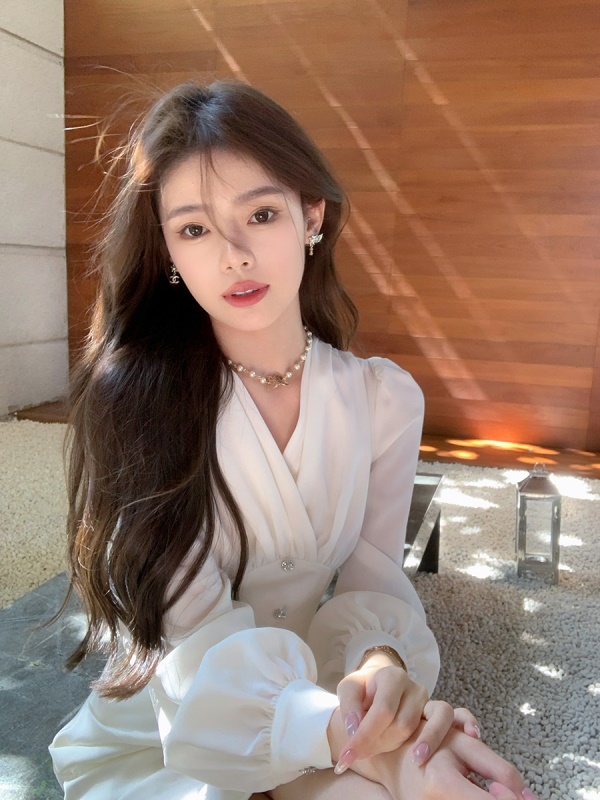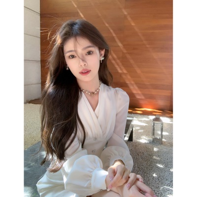 「白月光」珍珠蕾丝拼接长裙女春季新款v领法式裙子