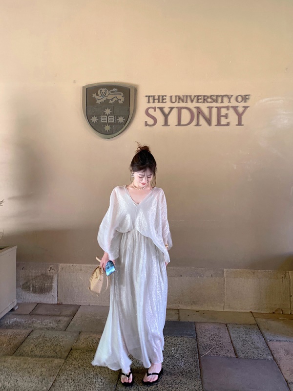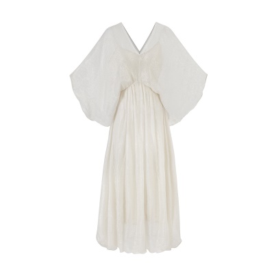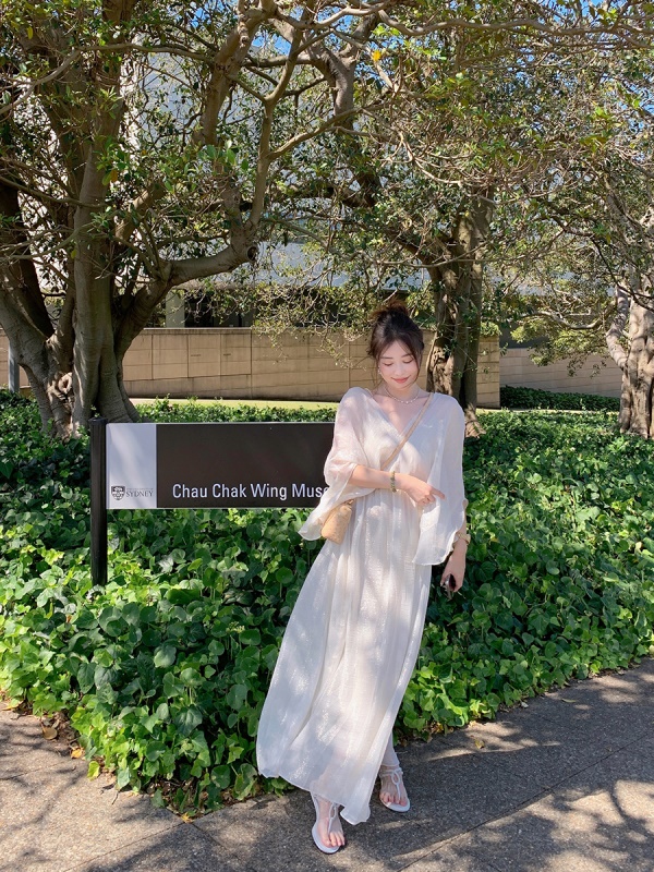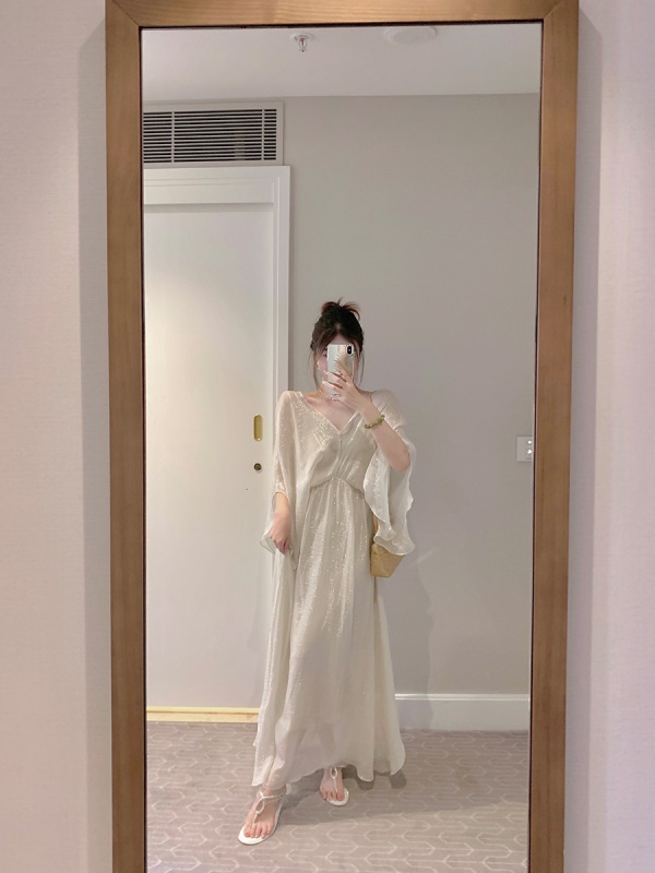 商品名称:ByYou 夏季新款高级感v领珠光桑蚕丝连衣裙长款灯笼袖仙女流光裙