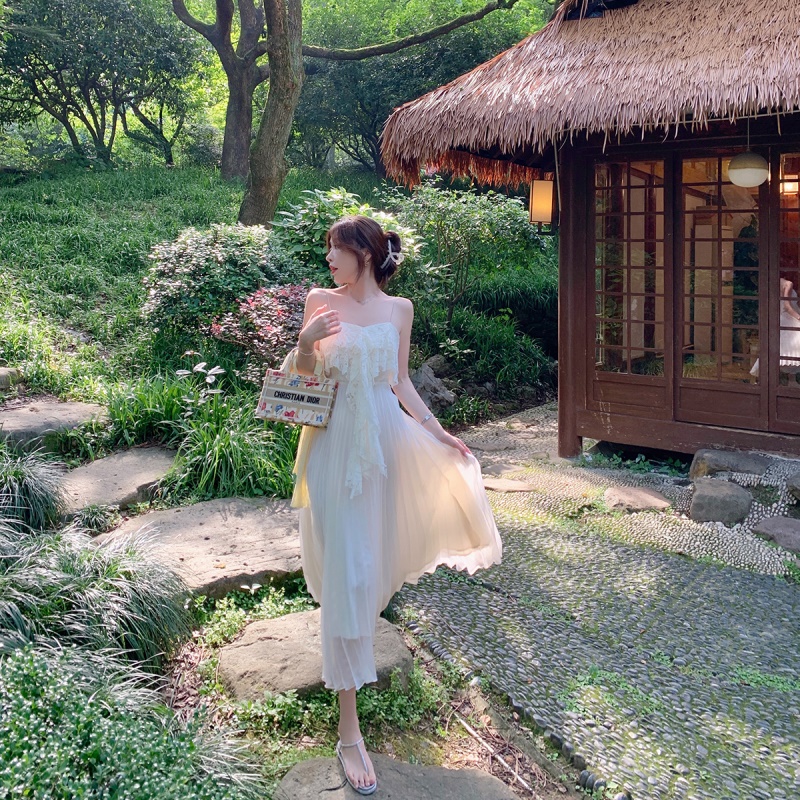 商品名称:ByYou 夏季白色蕾丝吊带连衣裙高级感气质显白收腰长款百褶仙女裙