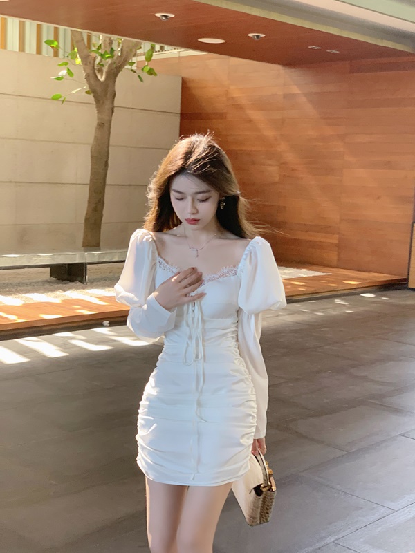 商品名称:ByYou 夏季新款高级感缎面白色连衣裙收腰泡泡袖公主裙法式短裙子