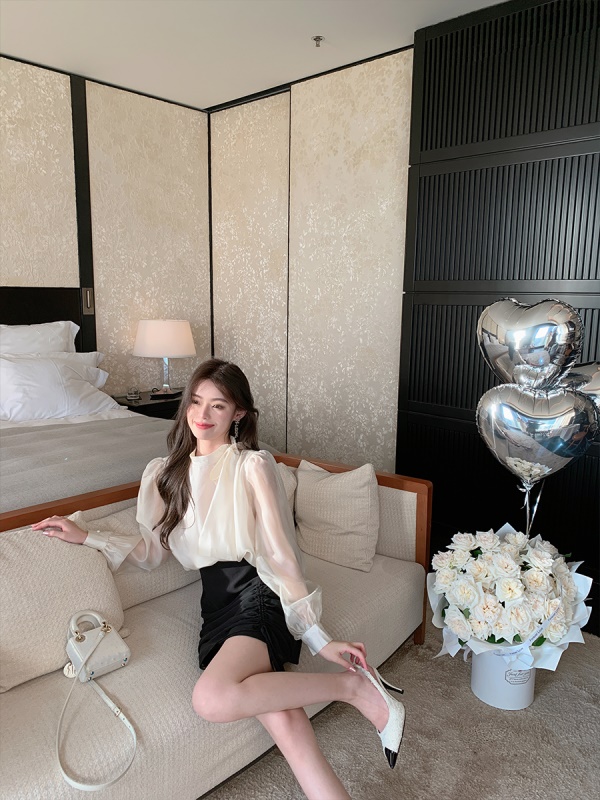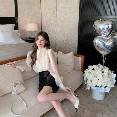 商品名称:ByYou 夏季白色高腰半身裙女设计感抽皱网纱拼接显瘦包臀短裙子