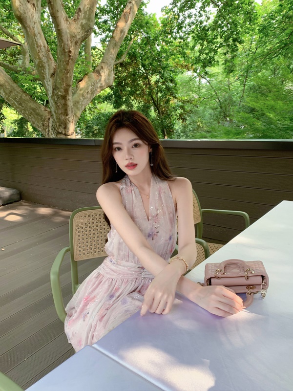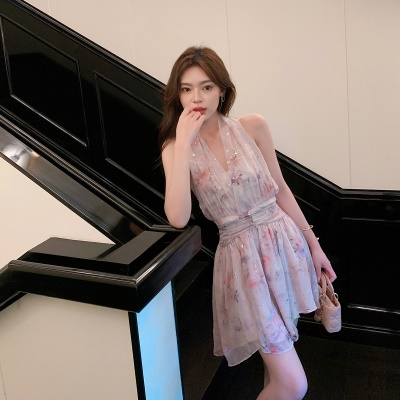 ByYou 夏季新款气质粉色v领挂脖碎花雪纺连衣裙收腰显瘦仙女短裙