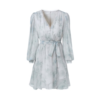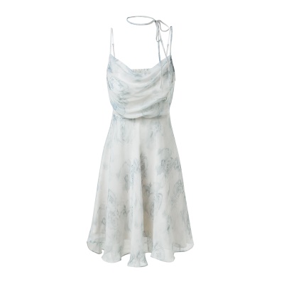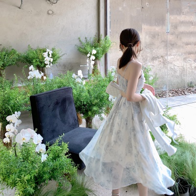 ByYou 天青色等烟雨气质v领蓝色碎花连衣裙收腰薄款吊带雪纺a字裙