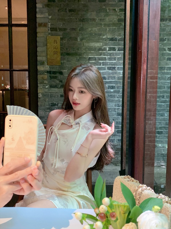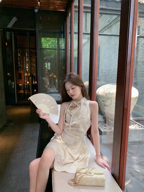 商品名称:ByYou 夏季新中式国风提花无袖白色缎面连衣裙收腰显瘦包臀短裙子