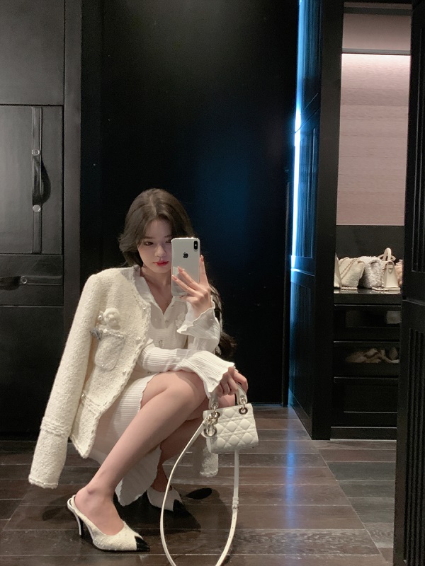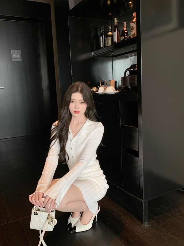 ByYou 秋冬新款翻领白色羊毛镂空针织连衣裙短款收腰显瘦百褶裙子