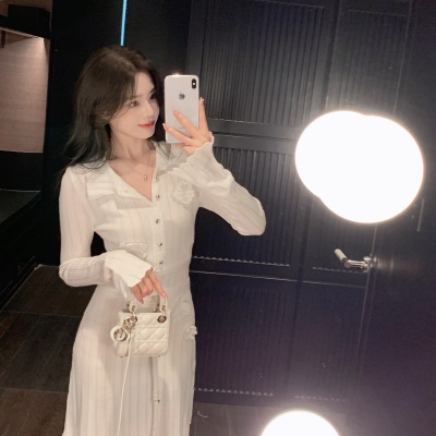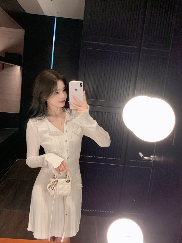 商品名称:ByYou 秋冬新款翻领白色羊毛镂空针织连衣裙短款收腰显瘦百褶裙子