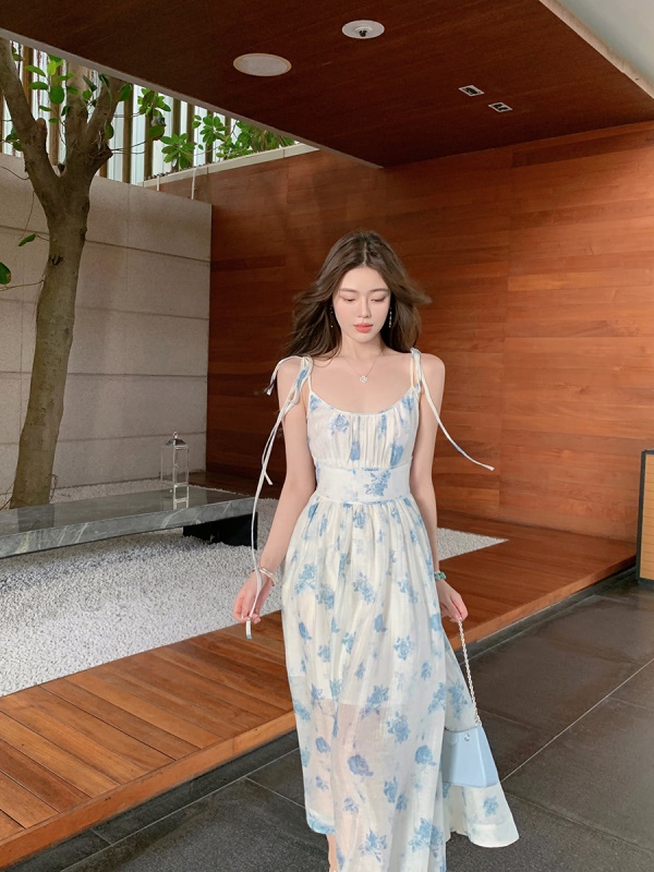 ByYou 2025新款气质蓝色碎花天丝吊带连衣裙收腰显瘦长款仙女裙子
