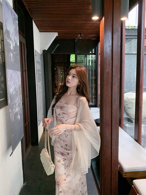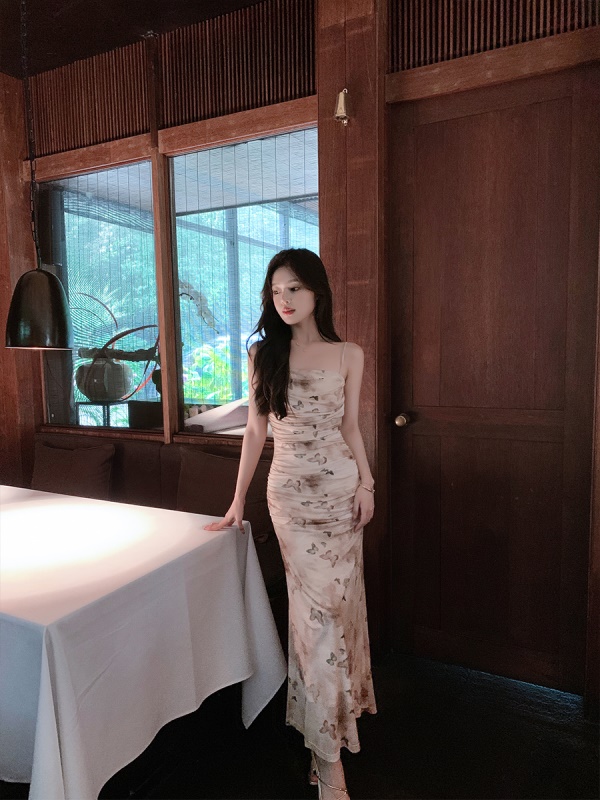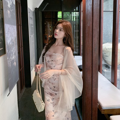 ByYou 夏季新款气质杏色网纱碎花吊带连衣裙紧身包臀鱼尾印花长裙