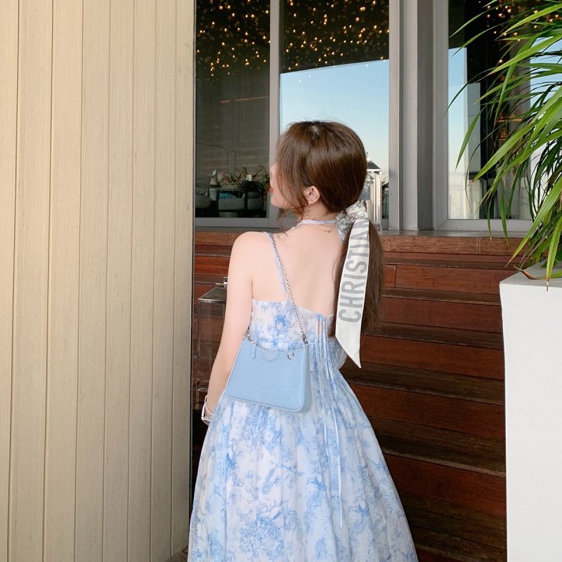 ByYou 春夏青花瓷V领天丝吊带连衣裙女收腰显瘦中长款百搭仙女裙