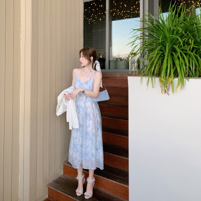 商品名称:ByYou 春夏青花瓷V领天丝吊带连衣裙女收腰显瘦中长款百搭仙女裙
