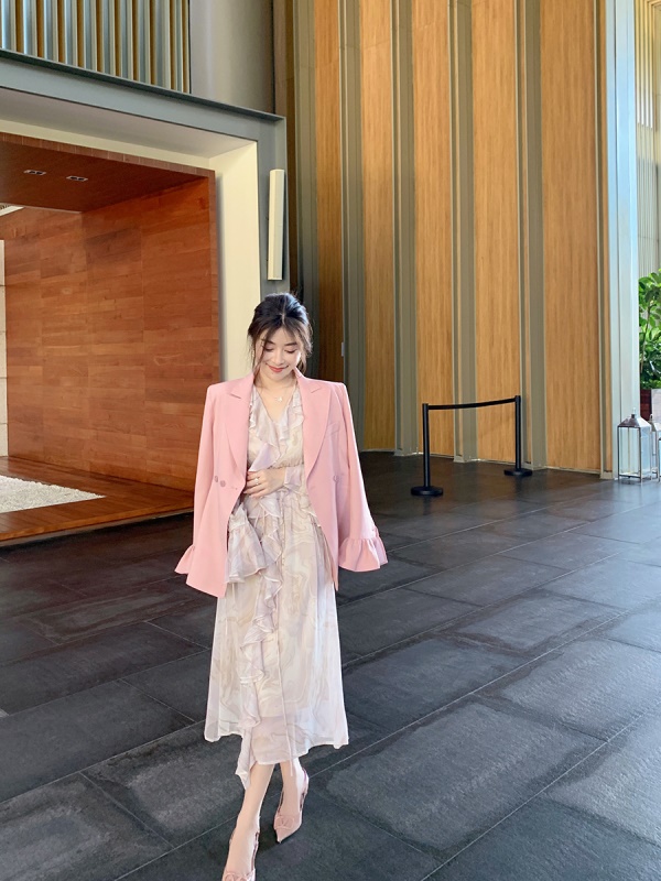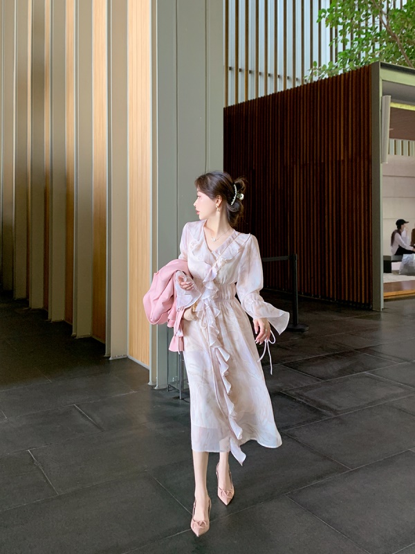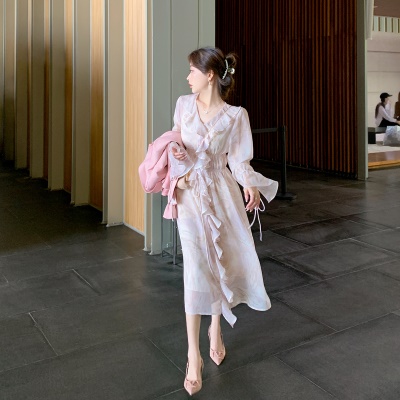 ByYou夏季粉色V领碎花雪纺连衣裙女收腰荷叶边中长款裙子含吊带裙