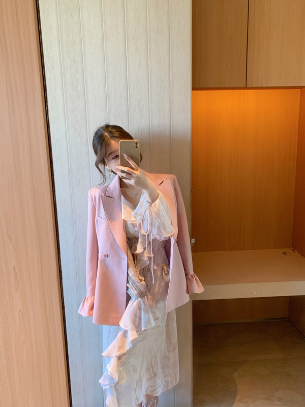 商品名称:ByYou夏季粉色V领碎花雪纺连衣裙女收腰荷叶边中长款裙子含吊带裙