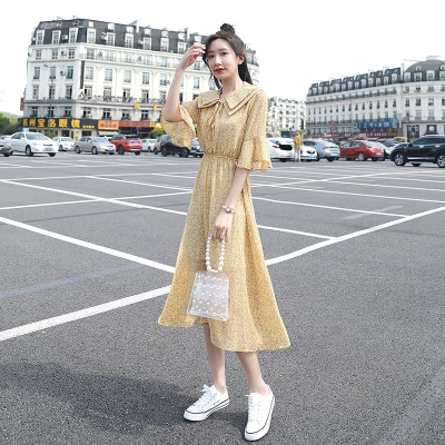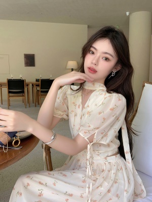 ByYou夏季鹅黄色泡泡袖V领碎花连衣裙女设计感飘带露腰中长款裙子