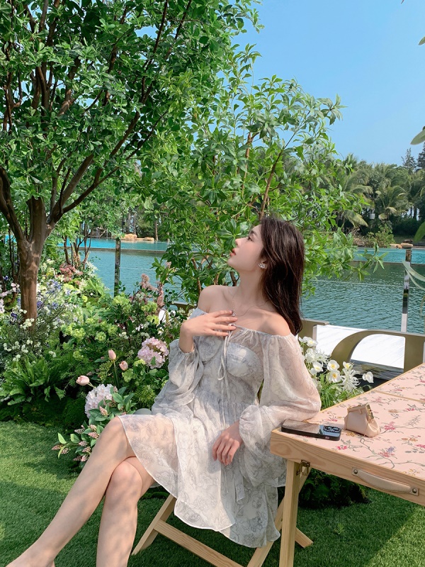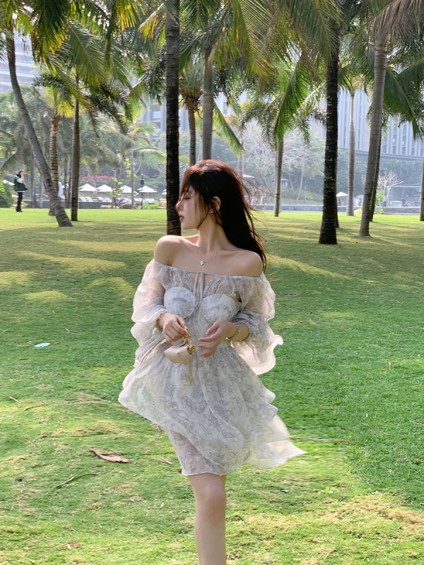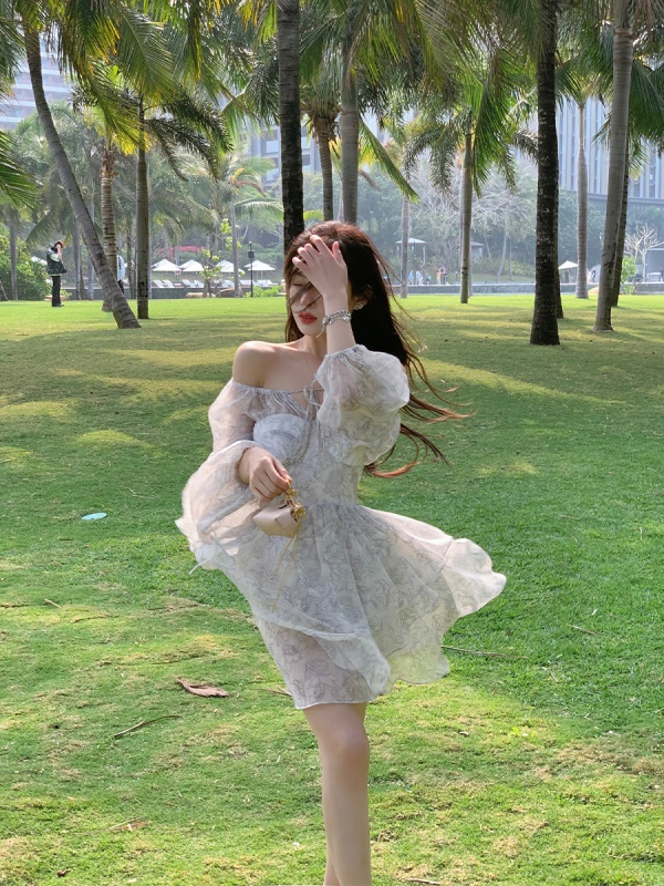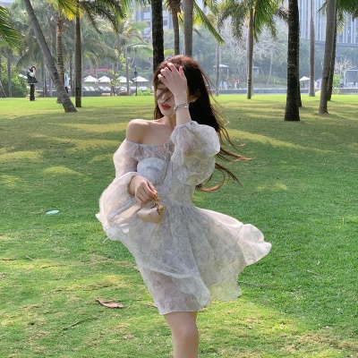 ByYou 夏季新款灯笼袖一字肩白色雪纺碎花连衣裙法式收腰仙女短裙