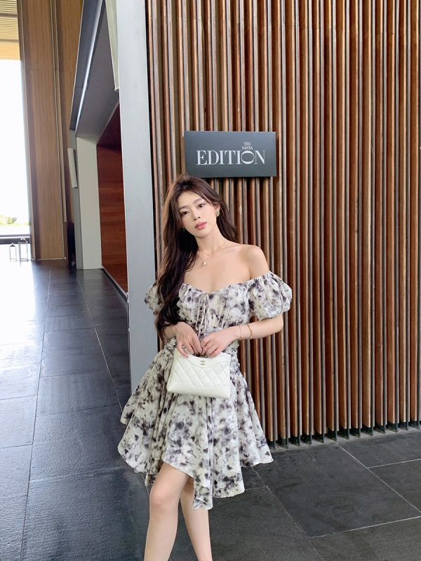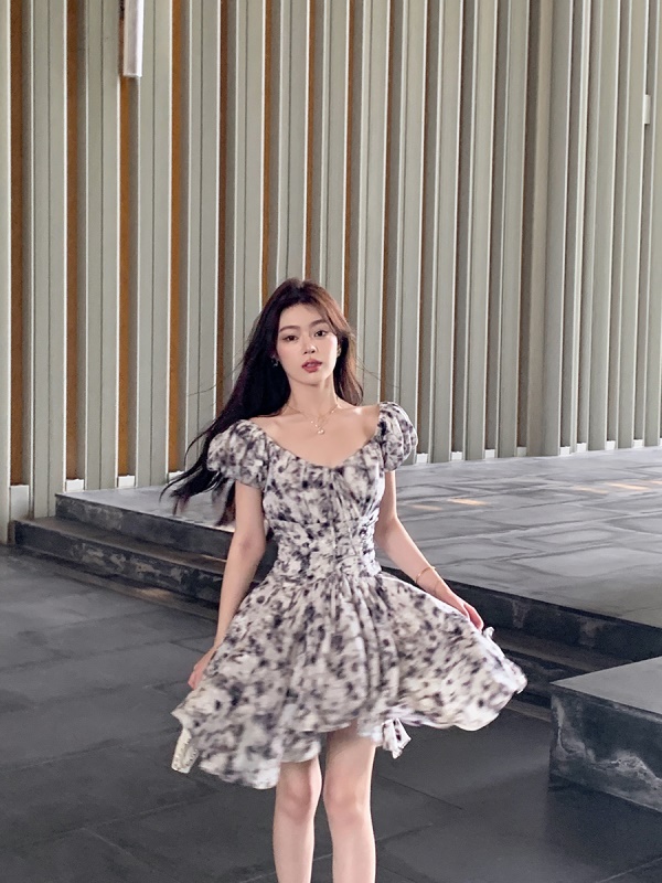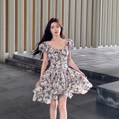 ByYou 夏季新款V领泡泡袖黑白色天丝碎花连衣裙气质收腰显瘦短裙