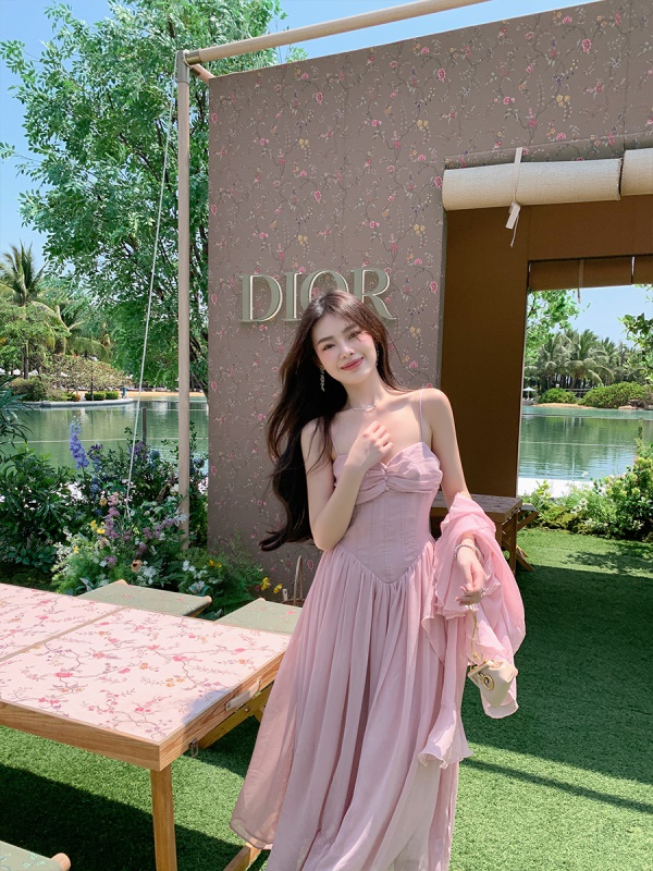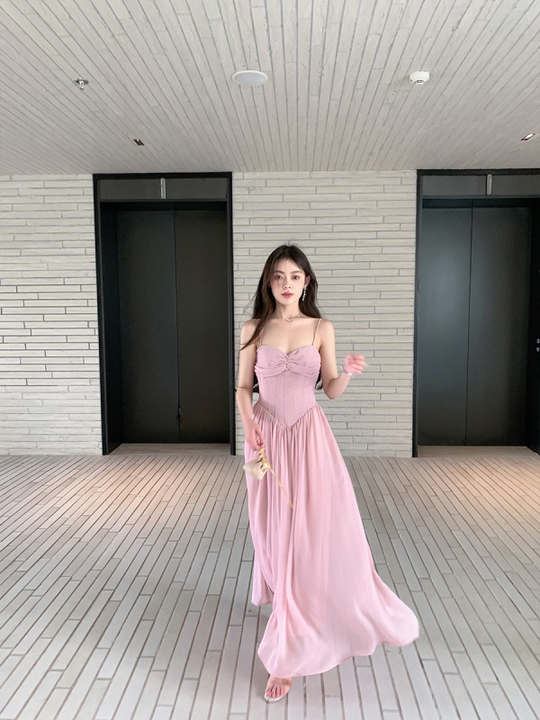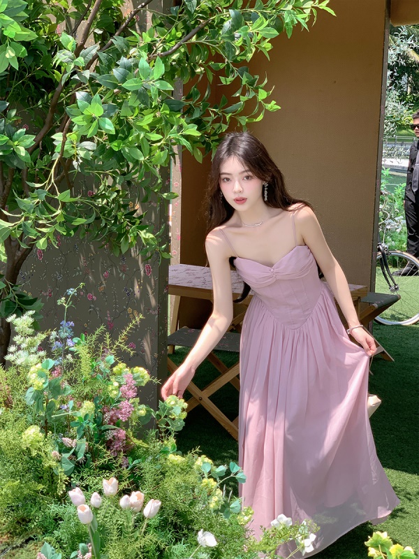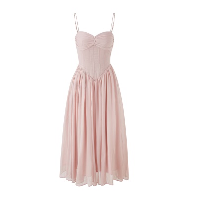 ByYou夏季粉色法式吊带V领连衣裙女收腰显瘦中长款雪纺裙子仙女裙