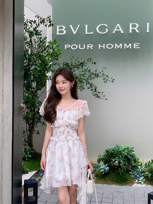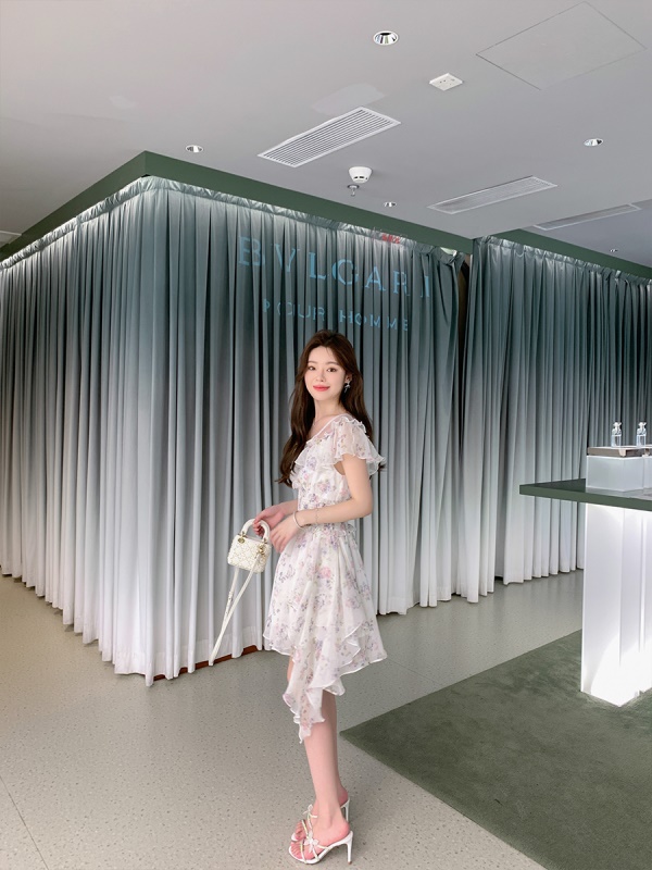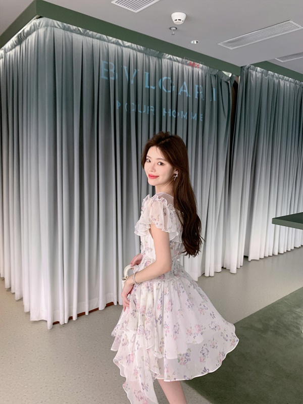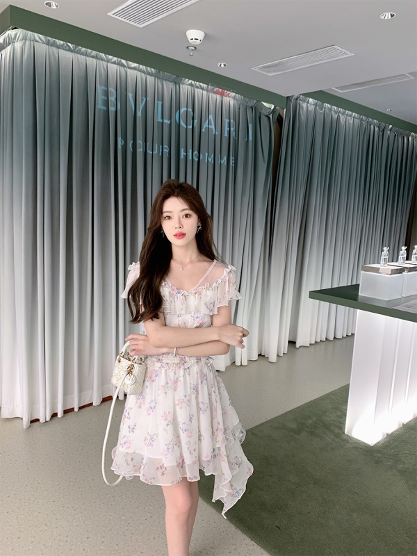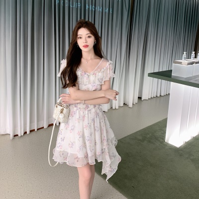 商品名称:ByYou 夏季新款碎花雪纺连衣裙女设计感荷叶边收腰打揽不规则短裙