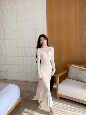 ByYou 春季修身高领羊毛白色针织连衣裙收腰中长款过膝内搭毛衣裙