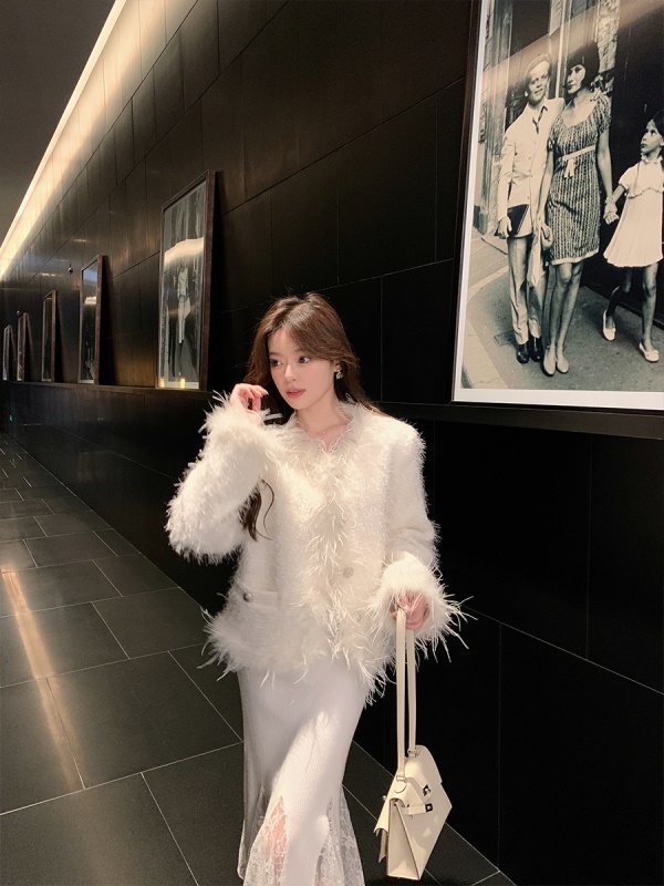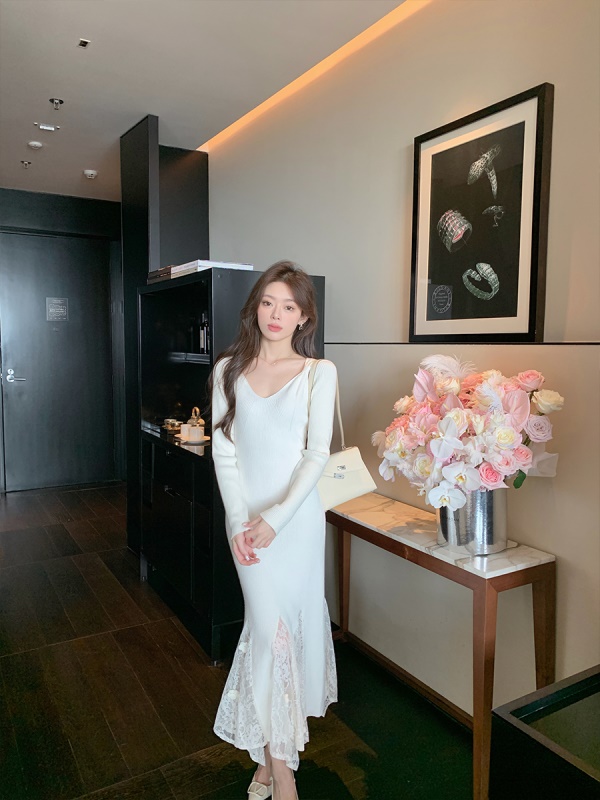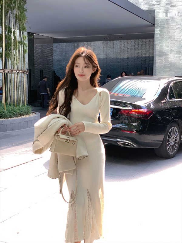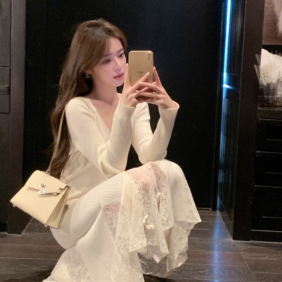 ByYou2025春季v领长袖拼接蕾丝白色兔绒针织连衣裙长款内搭毛衣裙