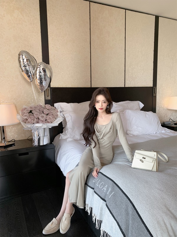 ByYou 秋冬新款性感方领长袖连衣裙中长款开叉包臀裙显瘦内搭裙子
