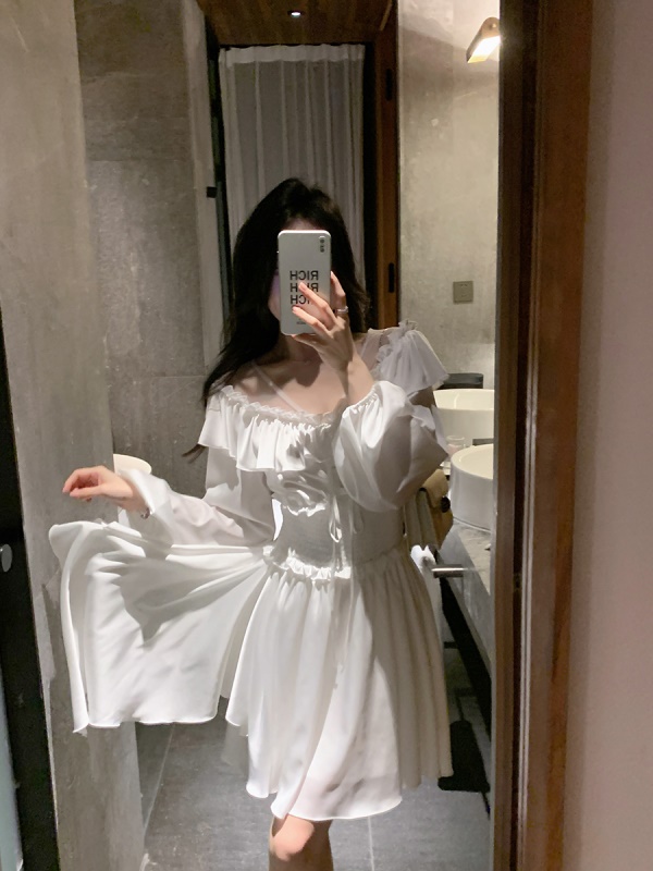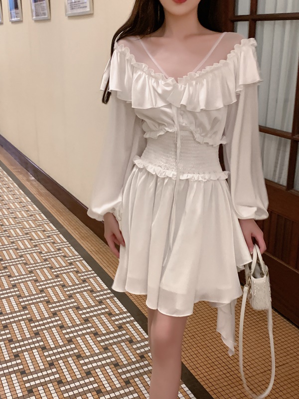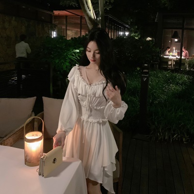 ByYou 夏季新款气质网纱V领缎面白色连衣裙收腰显瘦不规则短裙子