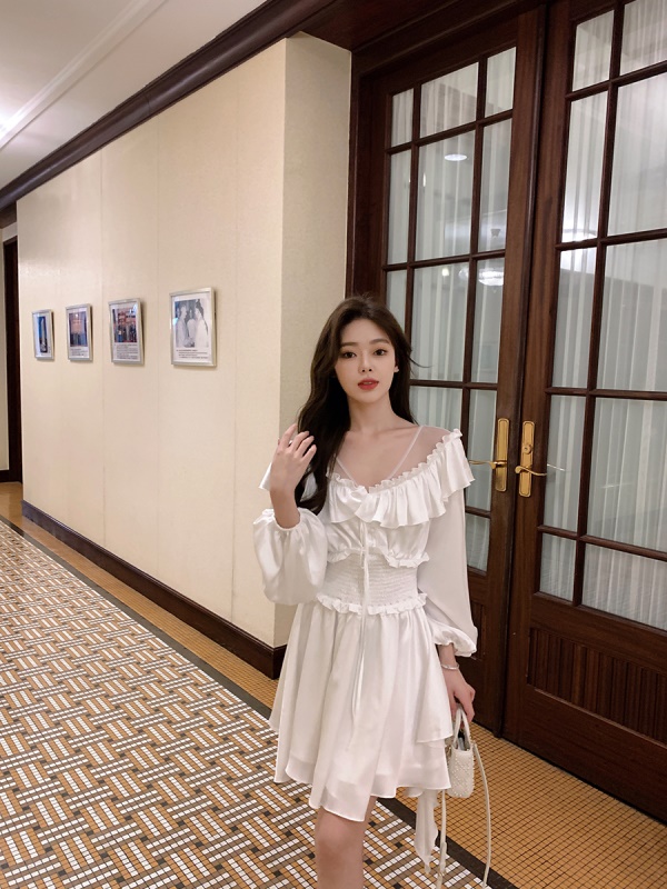 商品名称:ByYou 夏季新款气质网纱V领缎面白色连衣裙收腰显瘦不规则短裙子