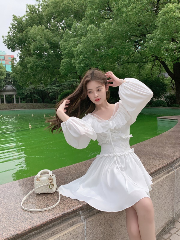 ByYou 夏季新款法式薄纱灯笼袖白色天丝连衣裙气质长款V领掐腰裙