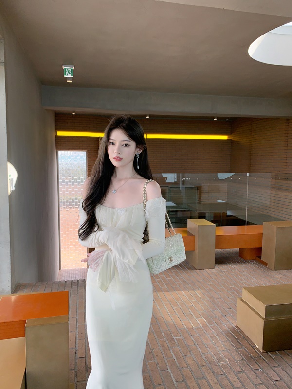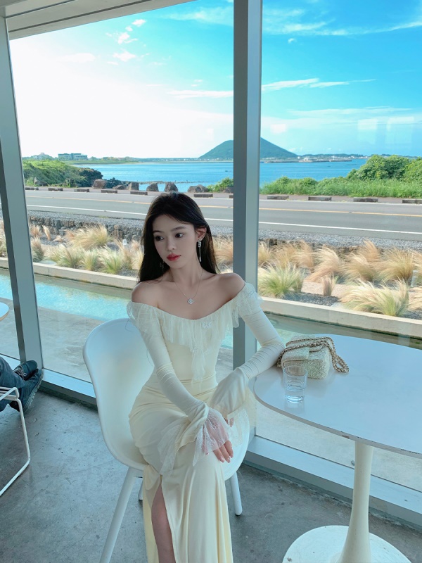 ByYou 秋冬新款温柔风蕾丝一字肩白色连衣裙喇叭袖侧开叉包臀长裙