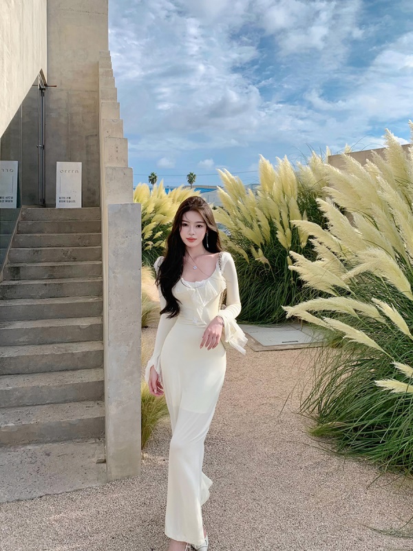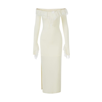 商品名称:ByYou 秋冬新款温柔风蕾丝一字肩白色连衣裙喇叭袖侧开叉包臀长裙