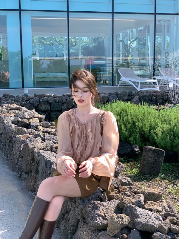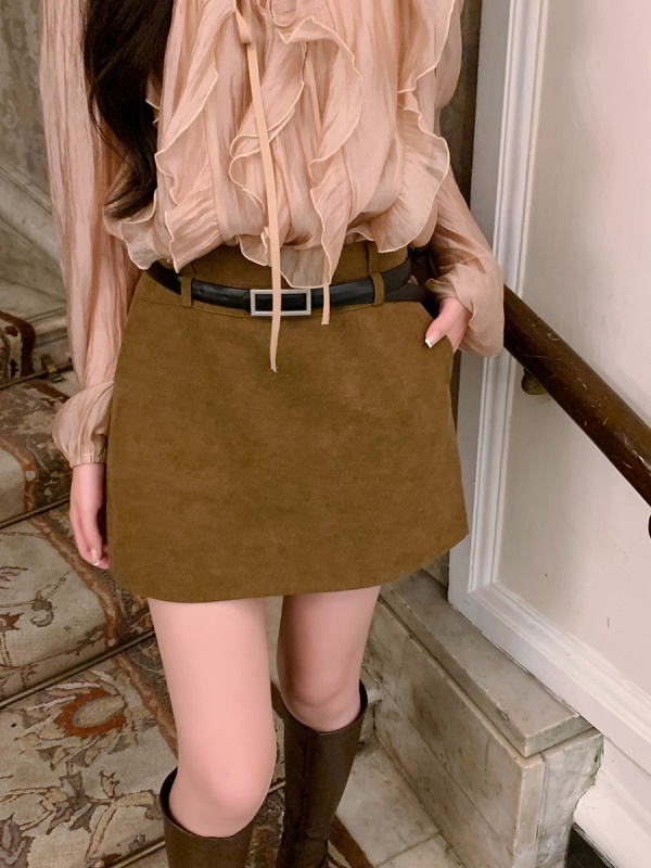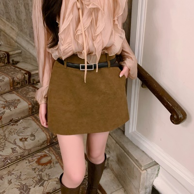 ByYou 秋季新款高级感鹿皮绒咖色高腰半身裙显瘦a字气质包臀短裙