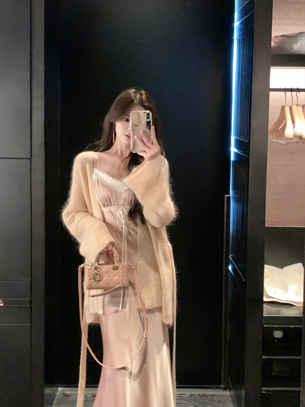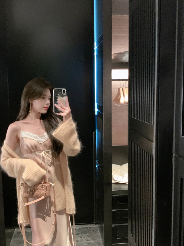 商品名称:ByYou 冬季新款纯欲粉色蕾丝拼接缎面吊带连衣裙修身内搭打底长裙