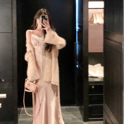 ByYou 冬季新款纯欲粉色蕾丝拼接缎面吊带连衣裙修身内搭打底长裙