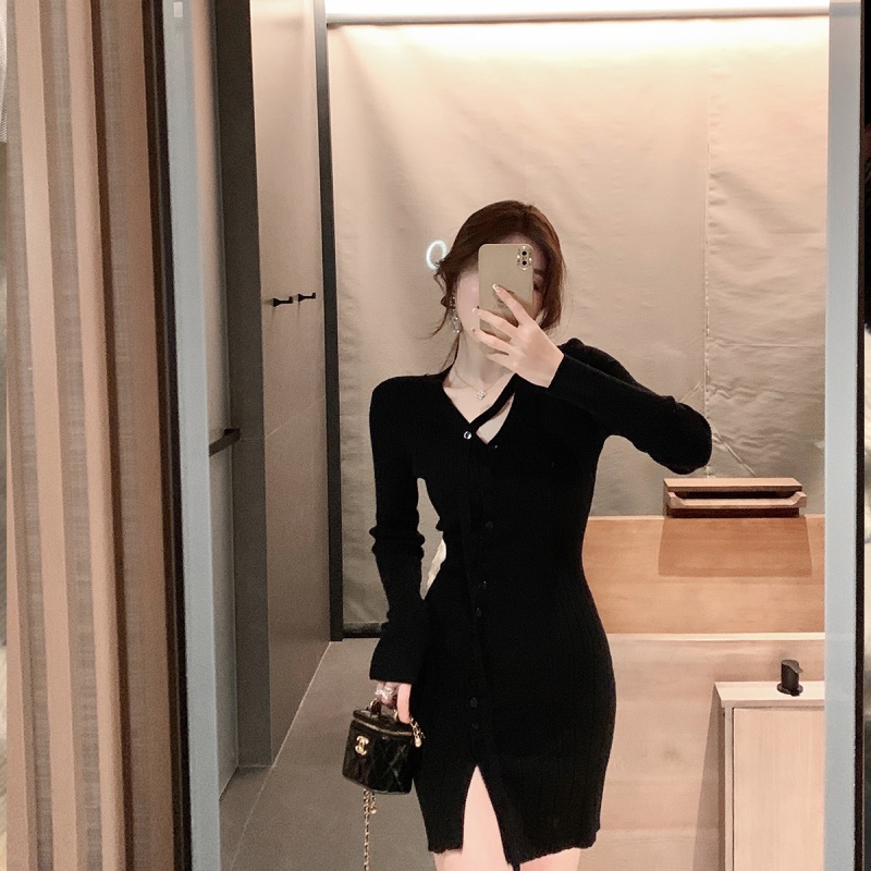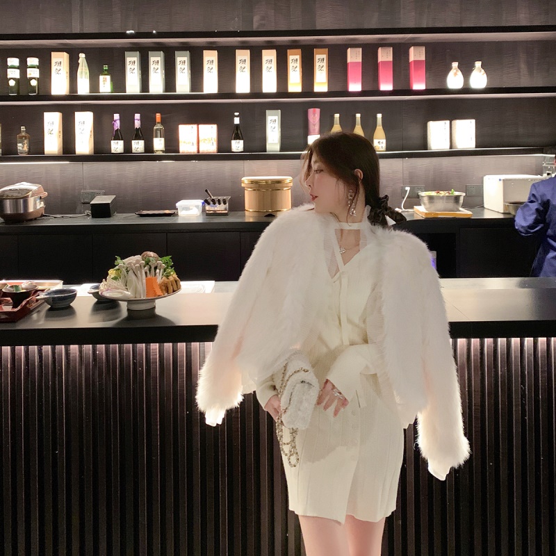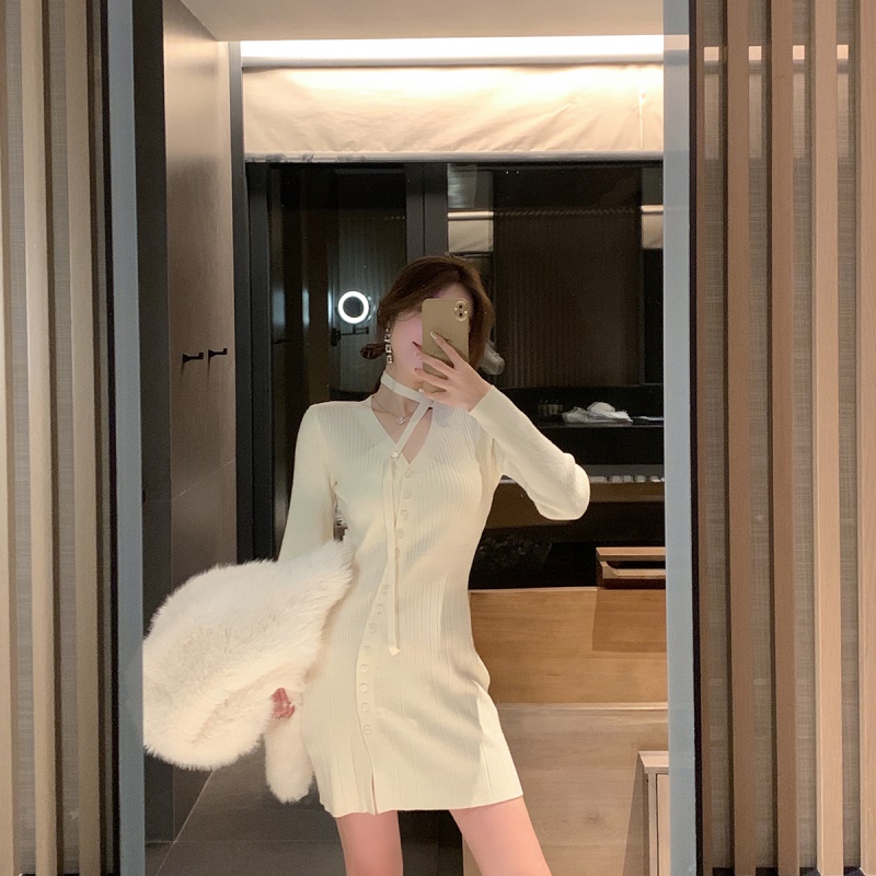 ByYou 2025春季纯欲v领白色兔绒织连衣裙收腰性感开叉内搭毛衣裙