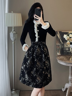 高级感黑色金丝绒衬衫连衣裙秋冬法式名媛女神范气质小洋装礼服裙