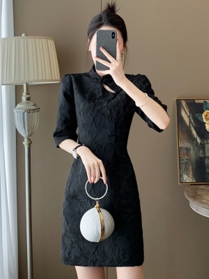 新中式国风中袖连衣裙女春夏2025新款高端气质收腰黑色礼服旗袍裙