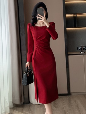 ByYou 春季白色气质V领兔绒针织连衣裙女收腰显瘦中长款开叉裙子