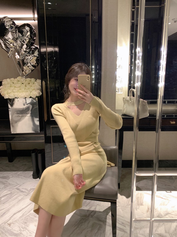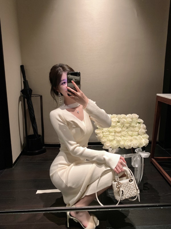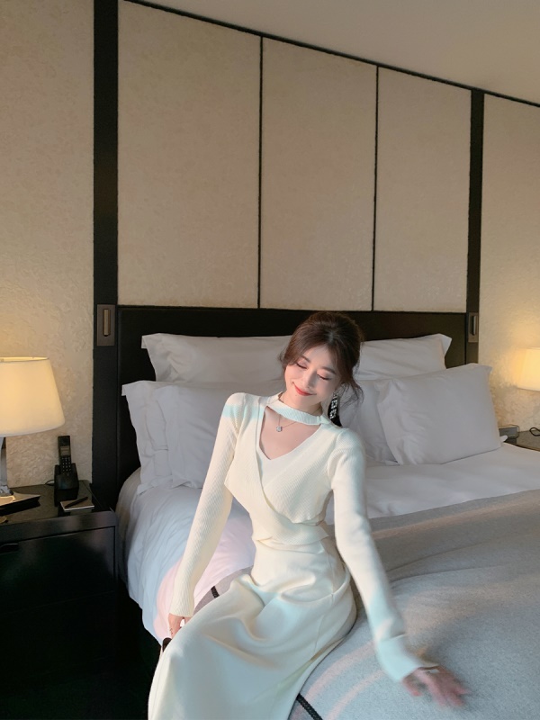 商品名称:ByYou 春季新款白色兔绒针织假两件连衣裙长款修身高级收腰毛衣裙