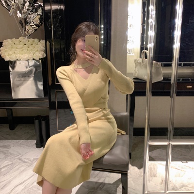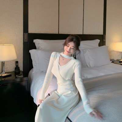 ByYou 2025春季纯欲v领白色兔绒织连衣裙收腰性感开叉内搭毛衣裙