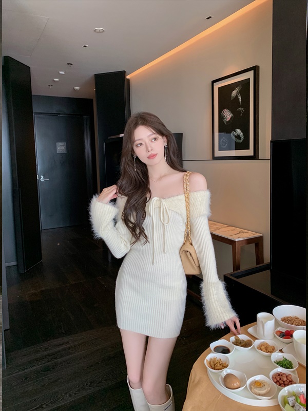 ByYou 冬季新款温柔风杏色一字肩针织连衣裙短款修身显身材毛衣裙