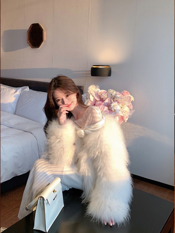 ByYou2025春季v领长袖拼接蕾丝白色兔绒针织连衣裙长款内搭毛衣裙