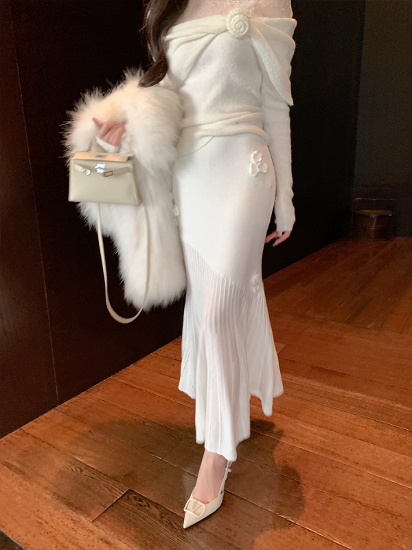 ByYou 冬季羊毛白色鱼尾针织半身裙长款过膝毛衣裙显瘦高腰包臀裙