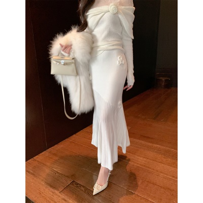 商品名称:ByYou 冬季羊毛白色鱼尾针织半身裙长款过膝毛衣裙显瘦高腰包臀裙