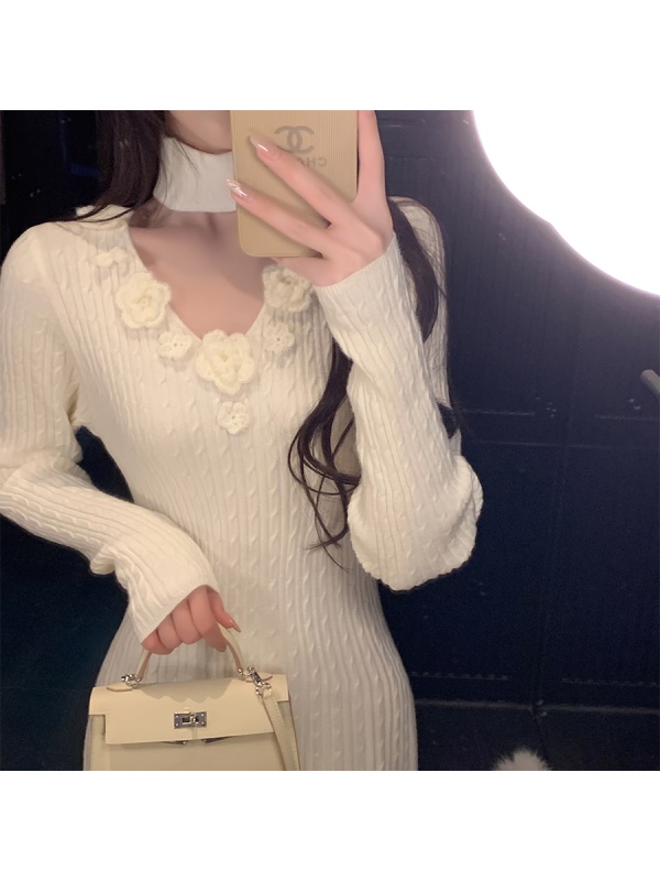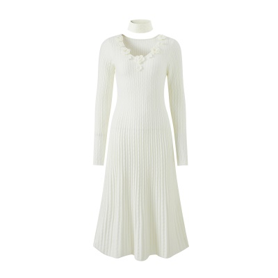 商品名称:ByYou秋冬气质v领白色内搭挂脖针织连衣裙长款过膝加厚打底毛衣裙