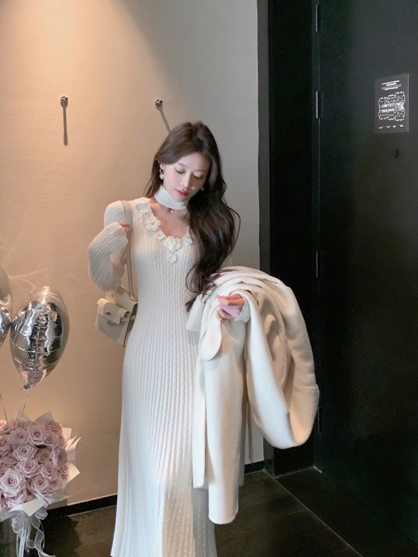 ByYou秋冬气质v领白色内搭挂脖针织连衣裙长款过膝加厚打底毛衣裙