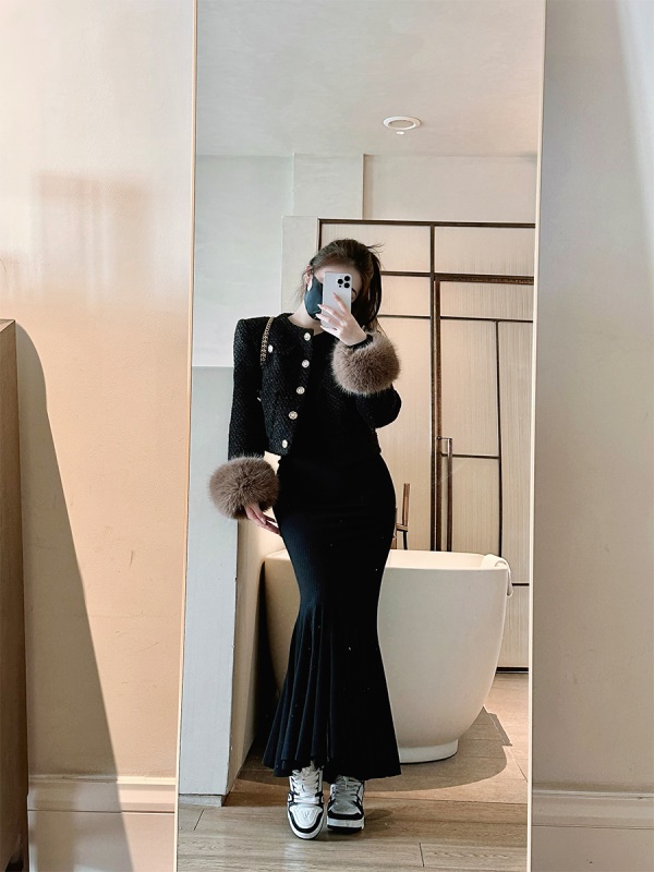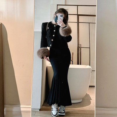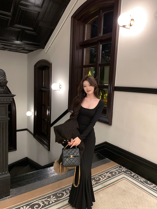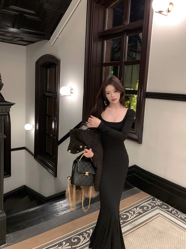 商品名称:ByYou 冬季新款方领赫本风黑色鱼尾裙内搭连衣裙长款性感包臀裙子
