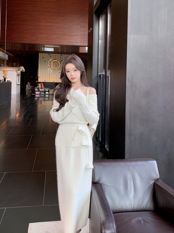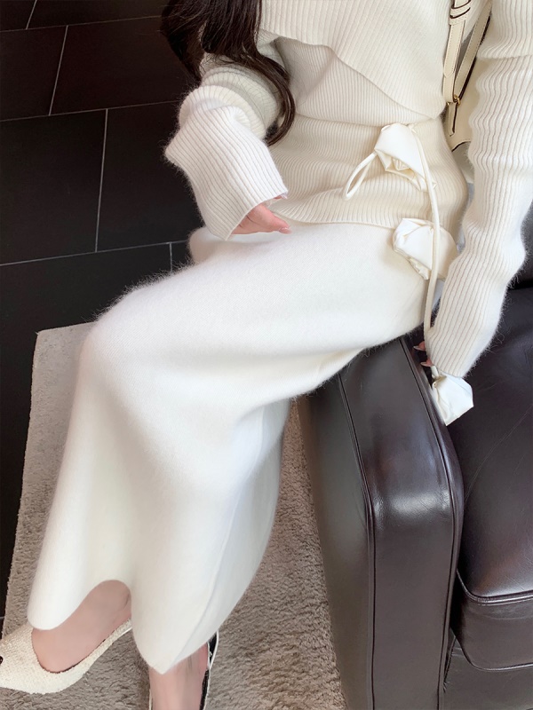商品名称:ByYou 冬季新款狐狸绒白色高腰针织半身裙修身长款过膝加厚毛衣裙